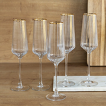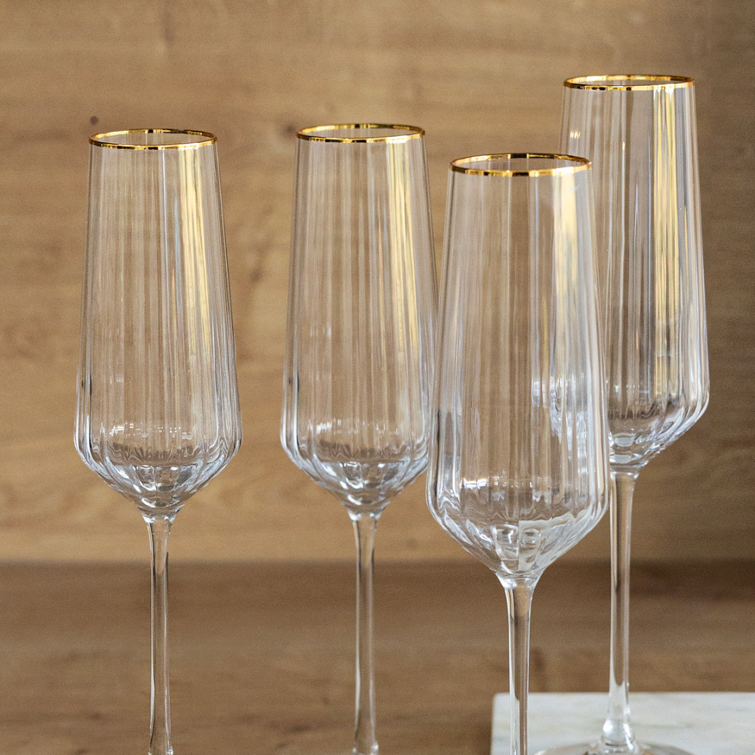 Kenmare Collection Champagne Flute Set of 4 is Tall Ribbed Champagne Flutes with Gold Rim
