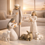 - 6 figures: Joseph in cream garment with wood staff; kneeling Mary in cream dresswith blue-gray cape holding baby Jesus in cream blanket; shepherd in cream garment carrying white lamb; gray-blue donkey, two white sheep: one standing, one lying down