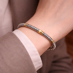 Featuring stainless steel and grey hematite beads, the design creates a bold contrast that enhances its visual appeal. Hematite, known for its deep earthy tones, symbolises stability and grounding, making this bracelet an ideal choice for the confident man who stands firm in his convictions. Whether worn for a formal occasion or as part of a casual everyday look, this versatile piece leaves a lasting impression.