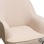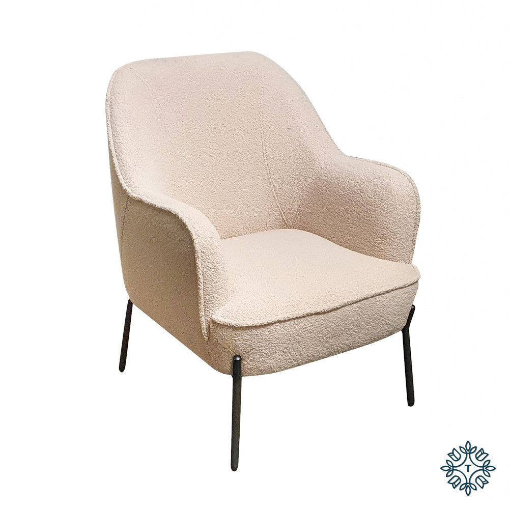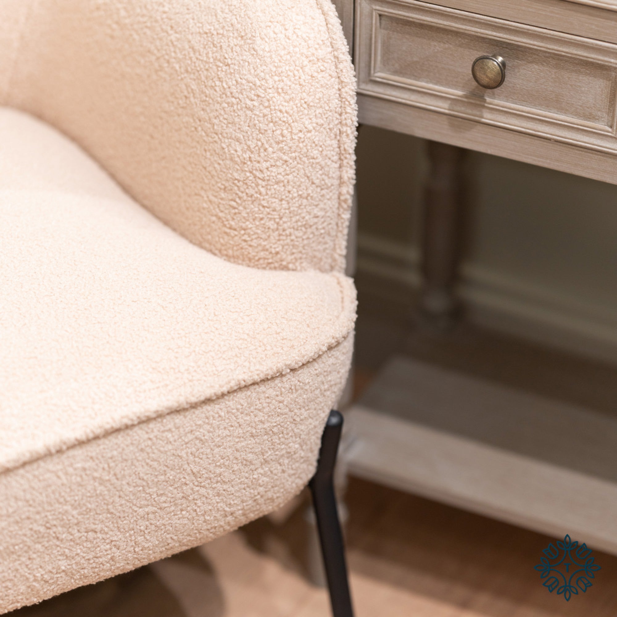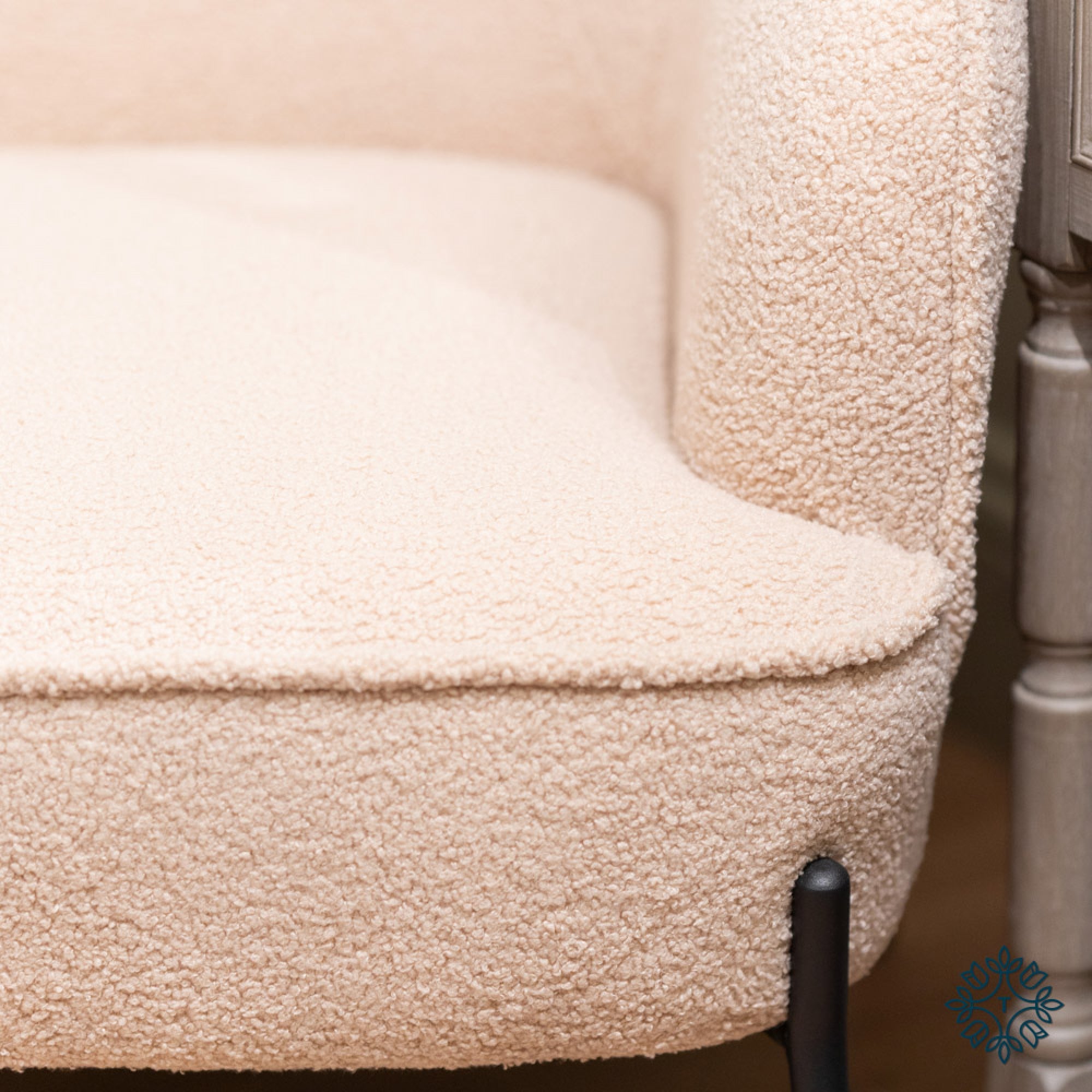 The CORINA Armchair in Bouclé Beige exudes comfort and style. With its soft bouclé upholstery and chic design it's a luxurious addition to any space. The beige tone adds warmth creating an inviting seating option that complements various interior aesthetics.