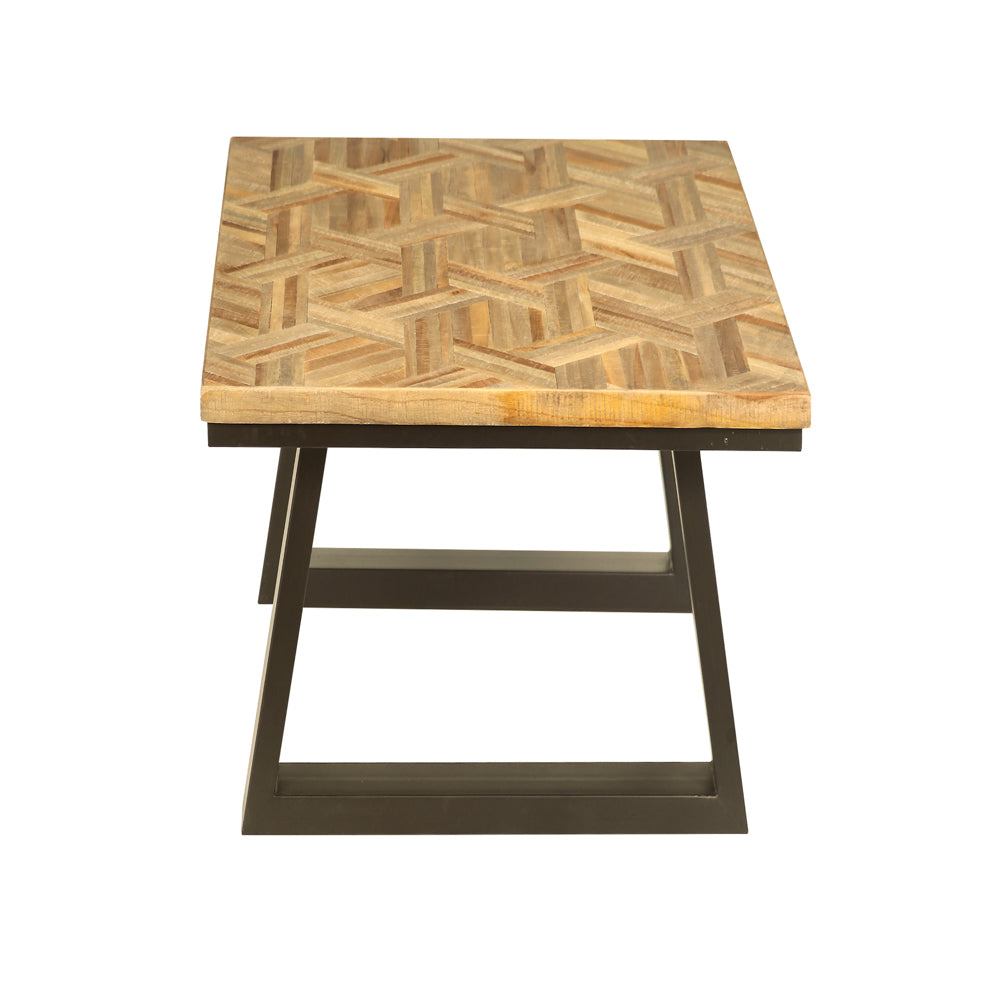 The Florence Coffee Table in a rectangle shape features a beautiful natural teak wood top and sleek metal legs. Its modern design seamlessly combines the warmth of the teak wood with the contemporary elegance of the metal legs. The table serves as a stylish centerpiece while providing a practical surface for your livin