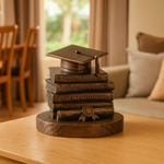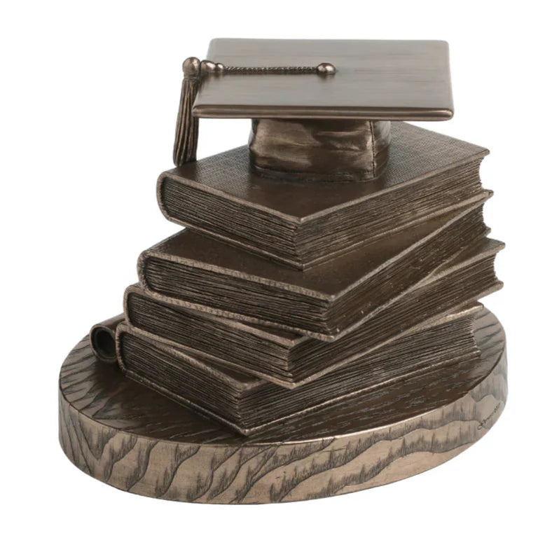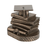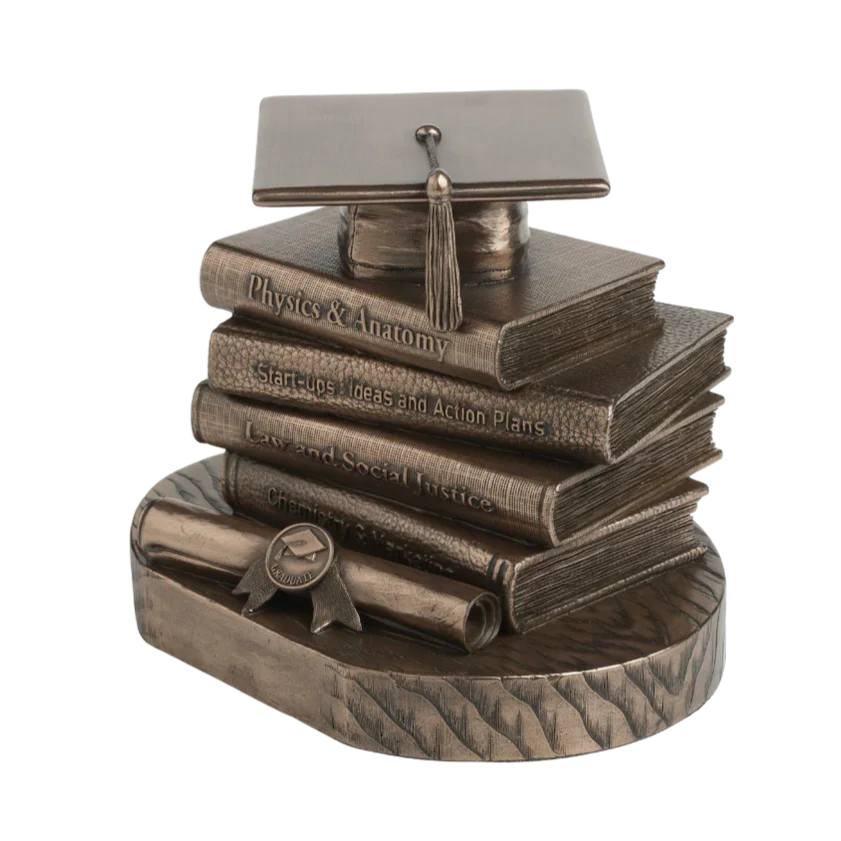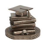 Celebrate academic achievement with this timeless Graduation Cap & Books Sculpture. The piece showcases a stacked arrangement of textbooks each titled with inspirational subjects like Physics & Anatomy, Law and Social Justice, and Start-ups & Action Plans. Topped with a graduation cap and accompanied by a rolled diploma, this sculpture makes an ideal gift for graduates, educators, or as a lasting memento of scholarly success.