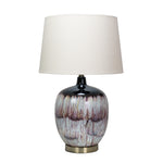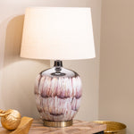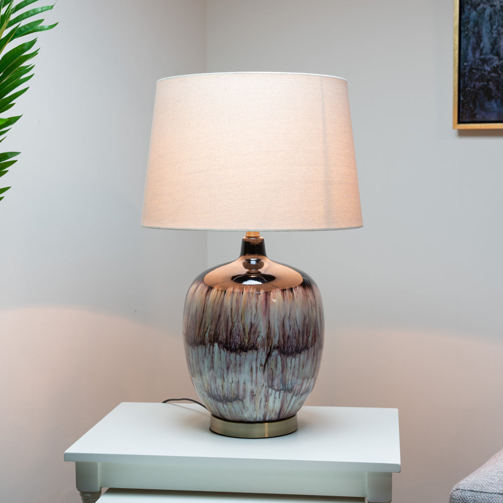 Add some beauty and brightness to your home with our lara table lamp. the bottle-shape body has a stunning modern look with a melting pot of purple, lilacs, pinks and damson hues, held at the base by a ring of antique gold metal. the simple, fuss-free gently flared white shade make your lounge or bedroom to glow with warmth.