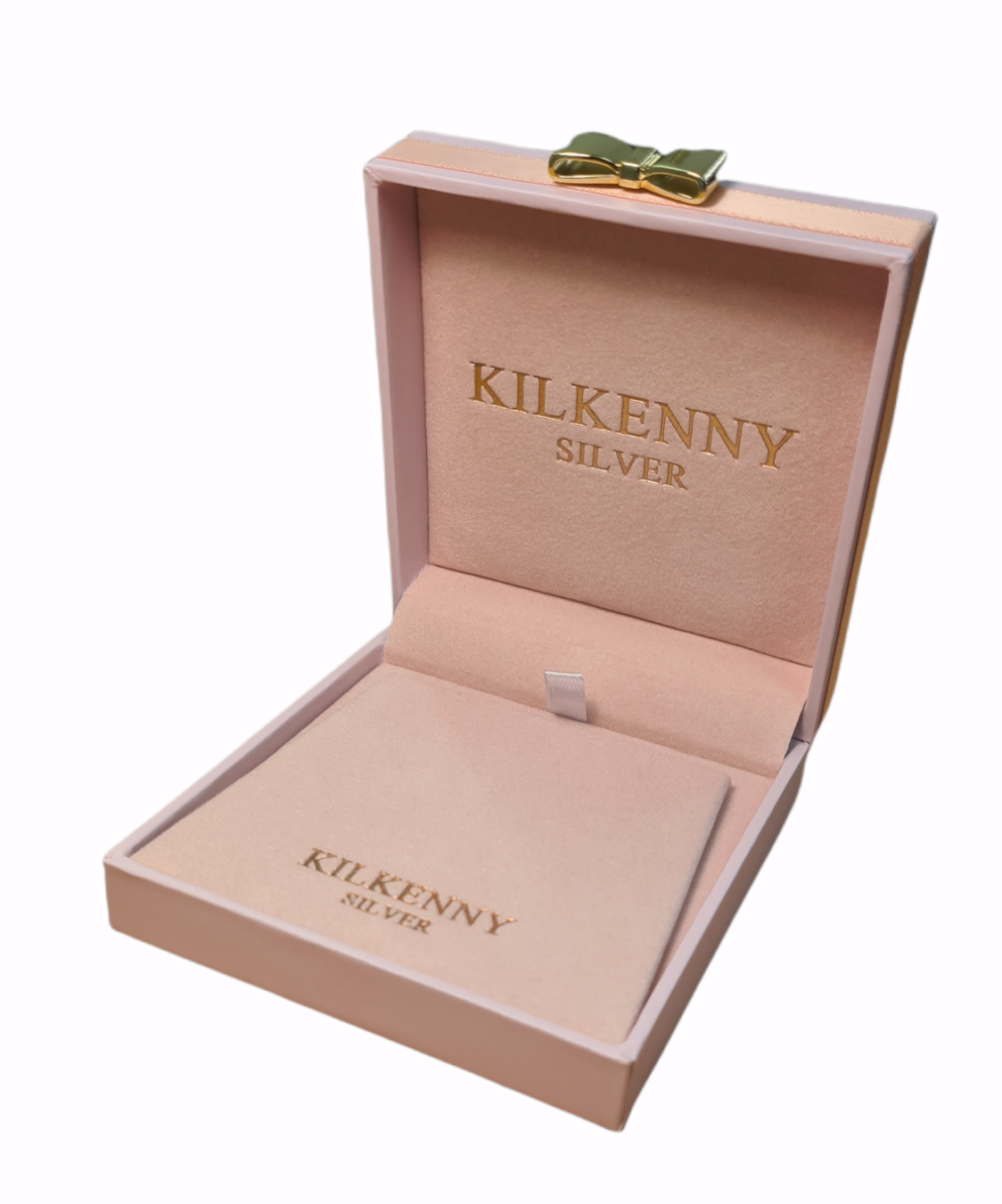 Kilkenny Silver Sterling Silver Disco Ball Stud Earrings are presented in a beautiful eye catching branded Kilkenny Silver pink box has a rich and gold metal bow and pink ribbon.