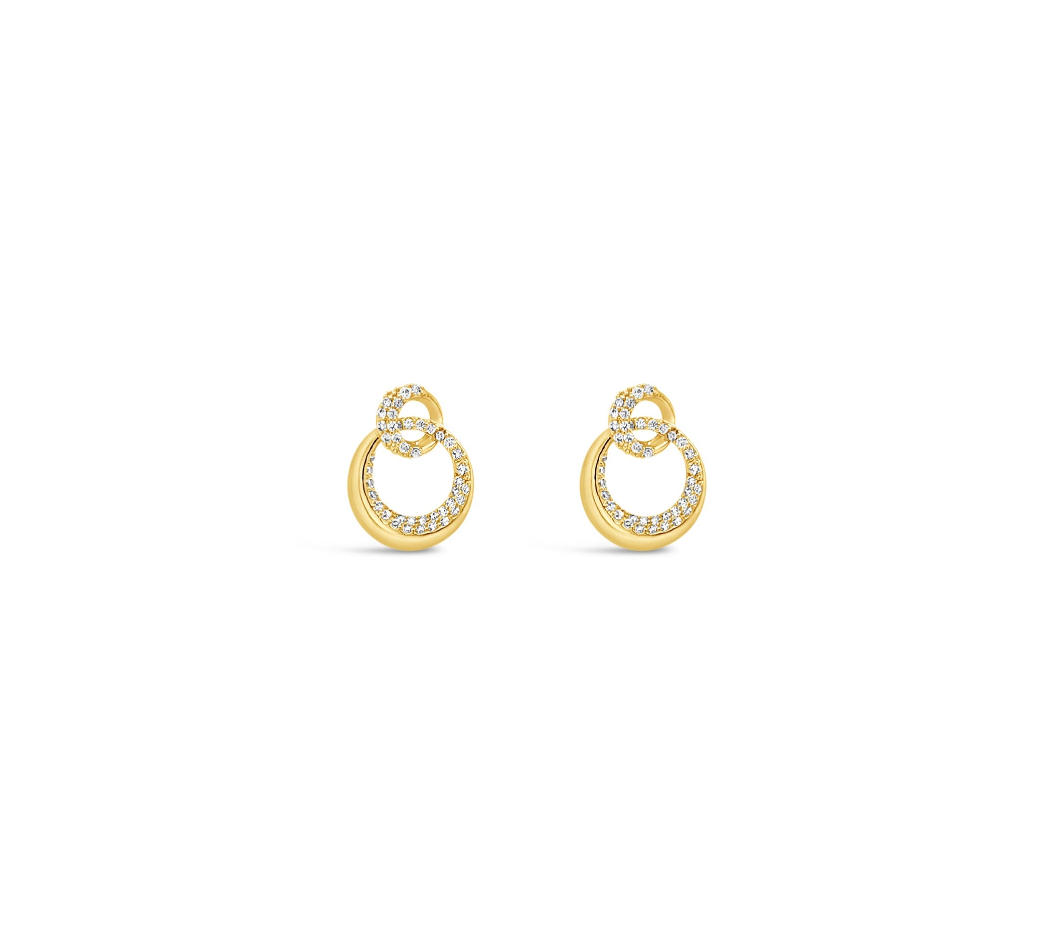 Symbolising connection and timeless style, these Gold Interlocking Circle Drop Earrings feature smooth gold rings accented with shimmering crystals. The layered design creates graceful movement while maintaining a refined and polished look.