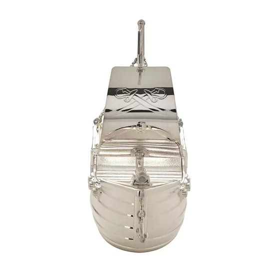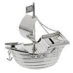 This fantastic pirate ship & sail has incredible detail and its gorgeous design ensures it will stand the test of time as a treasured keepsake for many years. The pirate ship has a coin slot on the deck and opens up from the bottom. A silver plated money box from our Bambino range. This wonderful keepsake provides glistening decoration for the nursery of new family arrivals which will be cherished eternally.