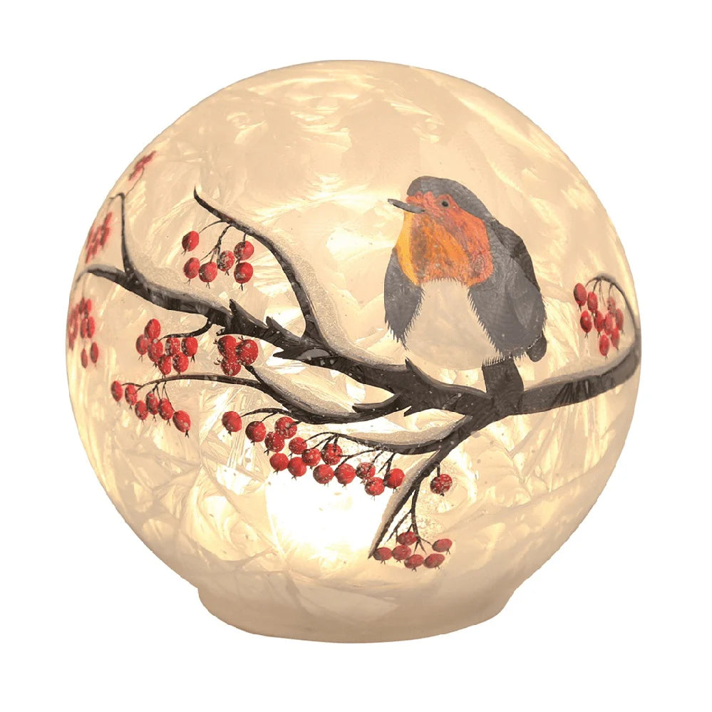 Add a warm, festive glow to your home with this charming LED Glass Robin Ball. Elegantly designed with a beautifully illustrated robin motif, this delicate glass ornament is softly illuminated from within by warm white LED lights. Frosted glass finish with a robin on a berry branch.