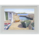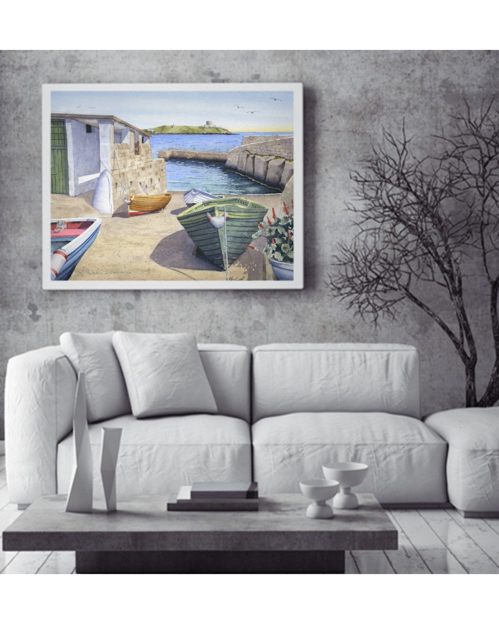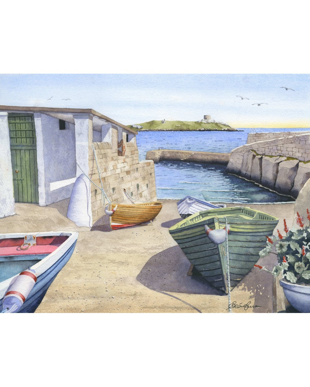 I painted this picture during a beautiful spell of sunny summer weather, that we too seldom get. The bright sun on the whitewash walls, the vibrant colours of the boats and the azure blue of the sea reminded me of fishing port you might see in Greece or Portugal.