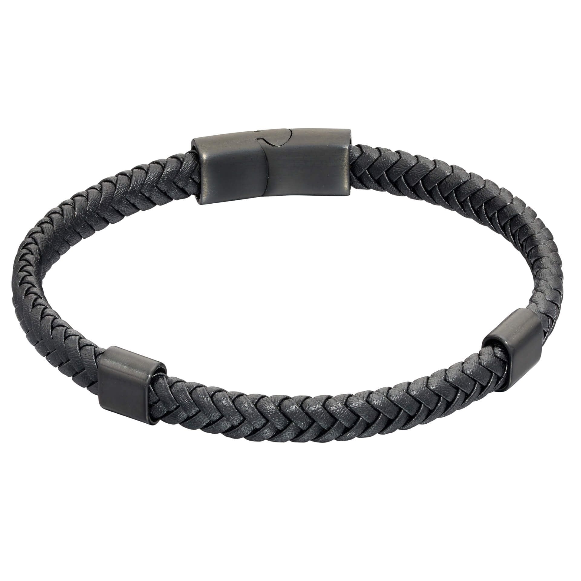 Fred Bennett Plaited Black Leather and Black IP Sections Bracelet
