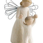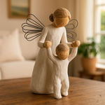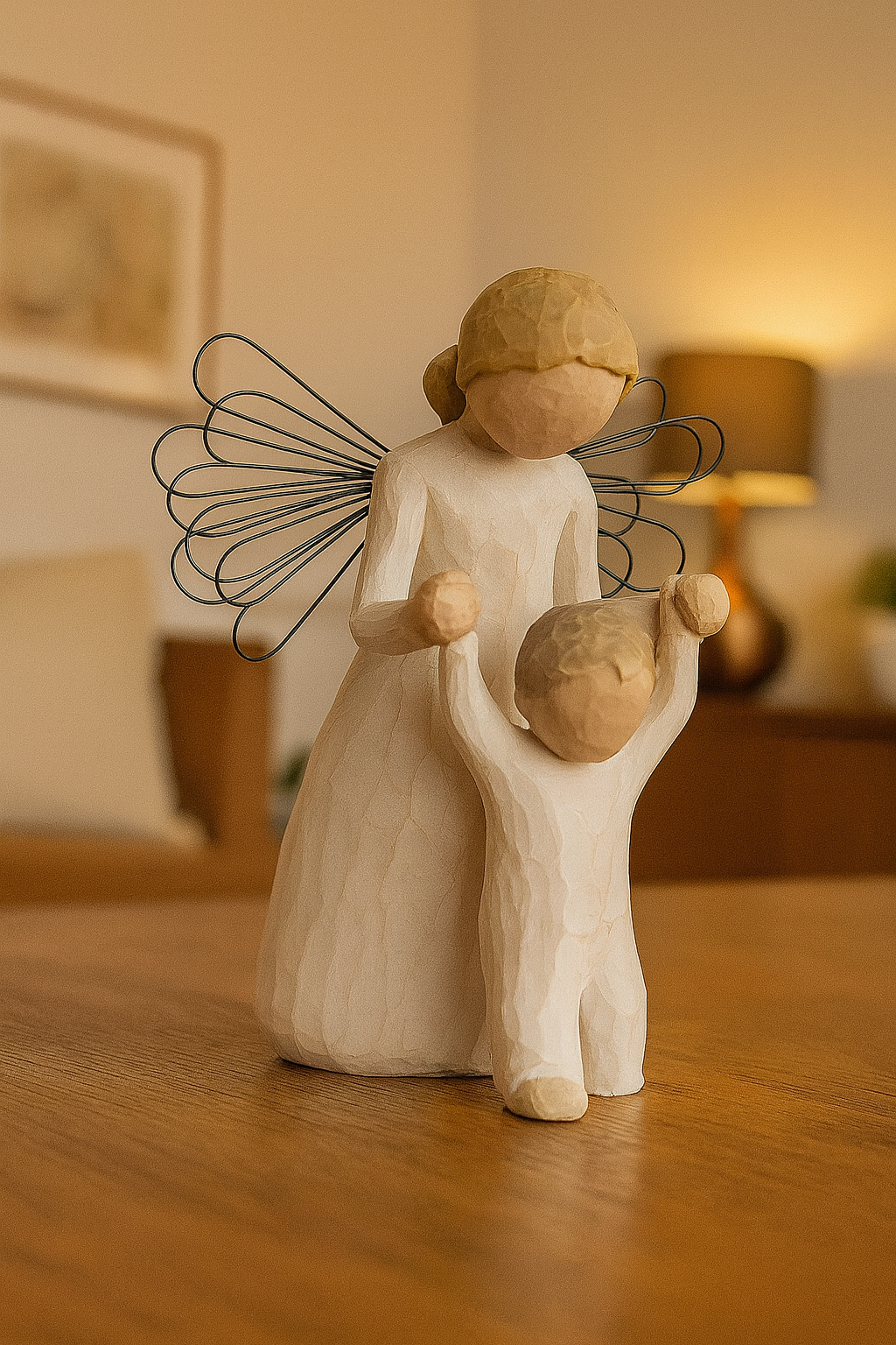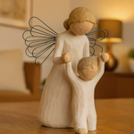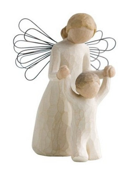 - Figure of angel in cream dress and wire wings, holding both hands of toddler in cream onesie walking in front of angel