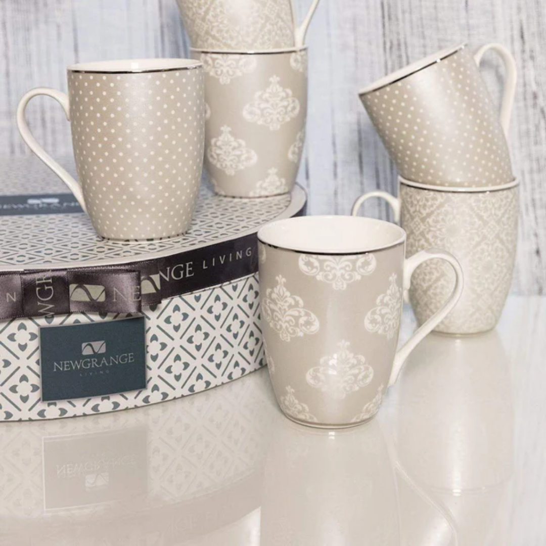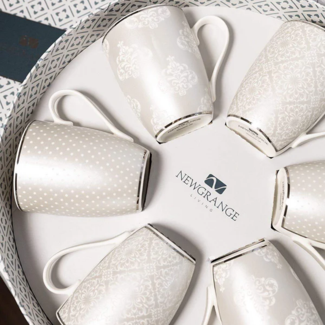 Newgrange Living are proud of their unique bone china range. The Karla set of 6 mugs display decorative and floral patterns embellished on a stylish silver base. A real eye-catcher that is sure to enhance your home life and social gatherings. This set of 6 mugs are delightfully presented in a stylish round gift box.