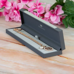 We take great pride in the craft and design that goes into creating a truly elegant and unique piece of modern fashion jewellery. This rose white stone and diamante bracelet comes beautifully presented in its own stunning gift box.