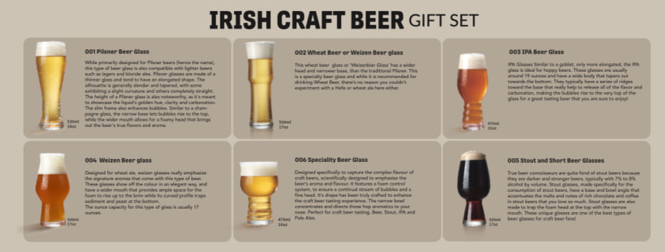 Experience the full flavour and aroma of craft beer with the Irish Craft Beer Gift Glasses Set by Killarney Crystal. This premium collection includes six expertly designed glasses, ranging in size from 470ml to 530ml, for the best appreciation of each type of beer. The elegant and innovative packaging, complete with a carry handle, makes this the perfect gift solution for any beer enthusiast. Made of lead-free crystal, this set is both stylish and functional. Cheers to a great gift!