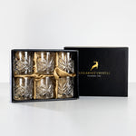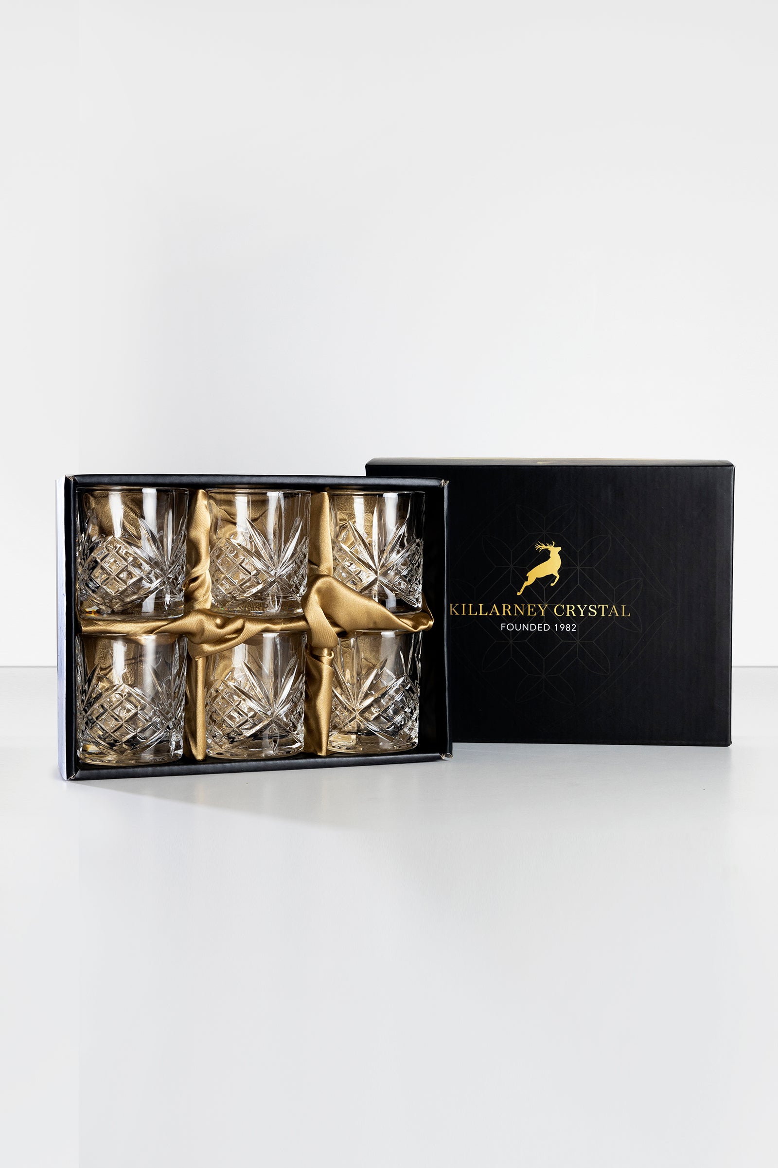 Set of 6 shot glasses from Killarney Crystal featuring our signature Trinity pattern and presented in a satin lined gift box