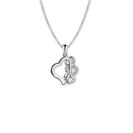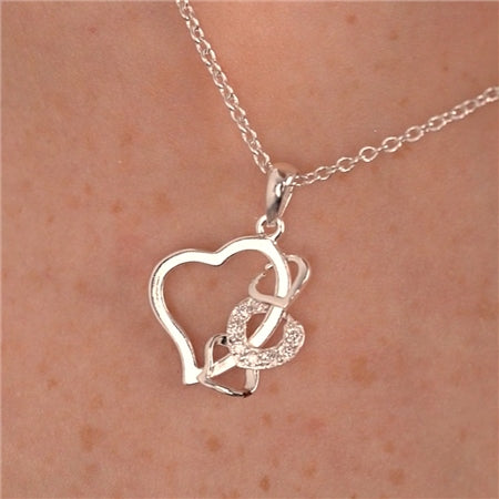 Silver plated heart pendant with a protective anti tarnish layer, one large heart with 3 smaller versions entwined within the piece, including clear Cubic Zirconia stone settings, presented in a Newbridge Silverware gift box. Product dimensions chain length 500mm with slider mechanism for easy adjustment