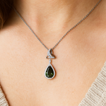 This feminine trinity knot pendant in rose gold will add dazzle to any occasion. It features a trinity knot symbol with sparkling clear crystal accents. A rich emerald green pear-shaped drop suspends from this. The centre stone has been cut to enhance its colour and brilliance and is completely surrounded by a full border of shimmering clear crystals. It suspends freely from a polished cable chain thread through the the trinity knot element. Fastening with a lobster claw clasp it has a 2” extension chain, and a TC branded fob completes the chic look.