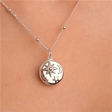 Product Features Silver Plated with a Protective Anti Tarnish Layer Sun Moon and Star Detail Locket Design, Holds Two Photos Presented in our iconic Newbridge Silverware Gift Box Dimensions Locket 17mm x 8mm, Beaded chain length 470mm plus a 55mm extension Model Name - Silver Plated Locket with Sun Moon & Stars