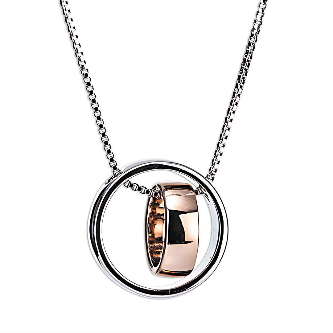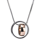We take great pride in the craft and design that goes into creating a truly elegant and unique piece of modern fashion jewellery. This silver and rose gold ring pendant comes beautifully presented in its own stunning gift box. All products come in gift packaging and designer gift bag. Size - Pendant Piece 20mm Dia. / Chain 42cm + 5cm Tail Chain Length