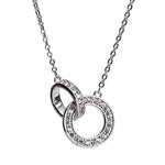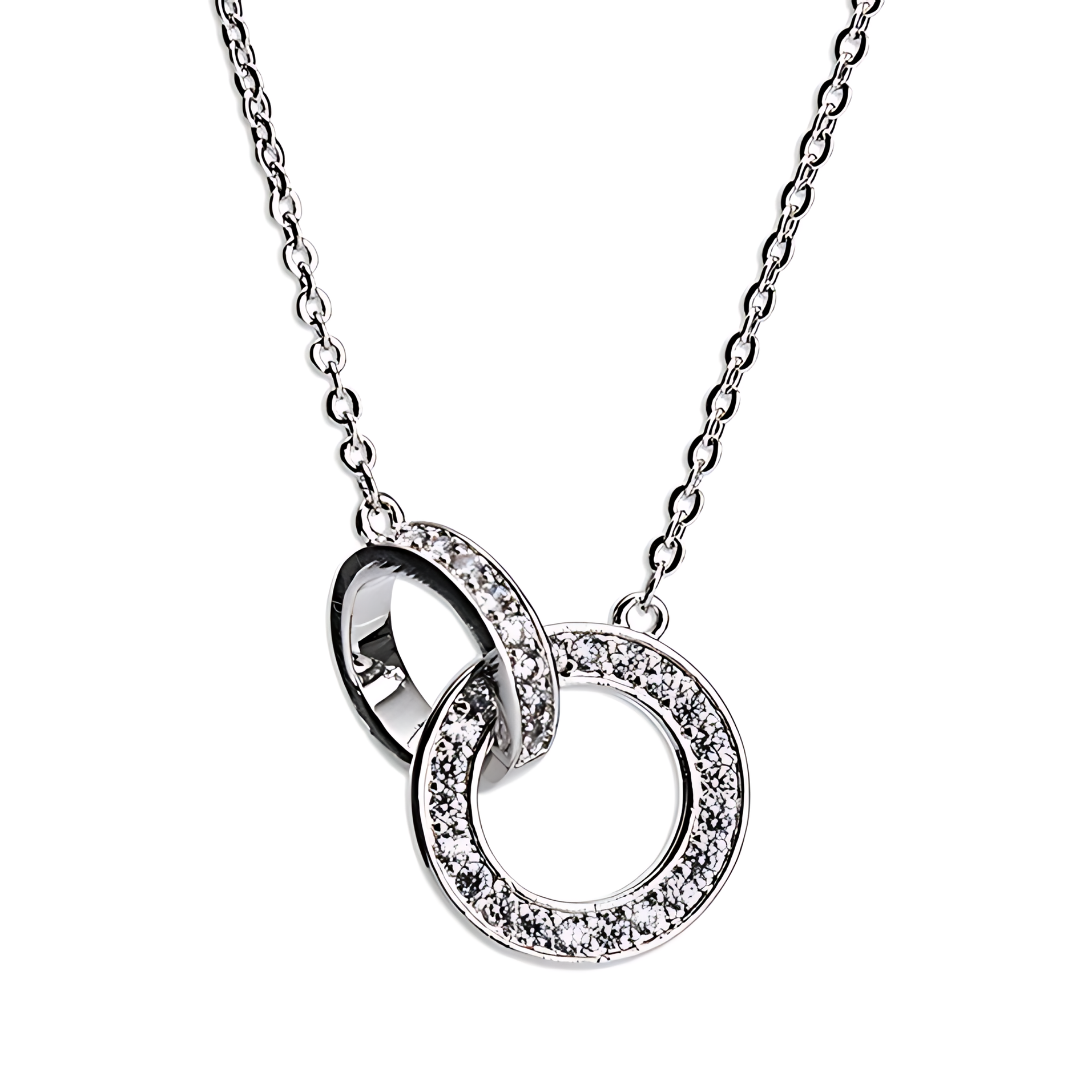 We take great pride in the craft and design that goes into creating a truly elegant and unique piece of modern fashion jewellery. This silver interlocking diamante necklace comes beautifully presented in its own stunning gift box. All products come in gift packaging and designer gift bag. Size - Pendant Piece Large 20mm Dia. Smaller 14mm Dia / Chain 42cm + 5cm Tail Chain LengthÂ