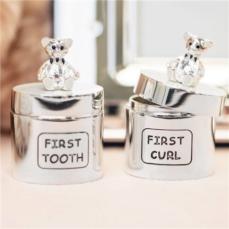 Classic and beautiful in design is how to describe this tooth and curl trinket set, the perfect keepsake for new parents or as a christening present.
