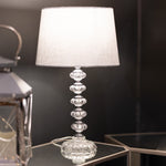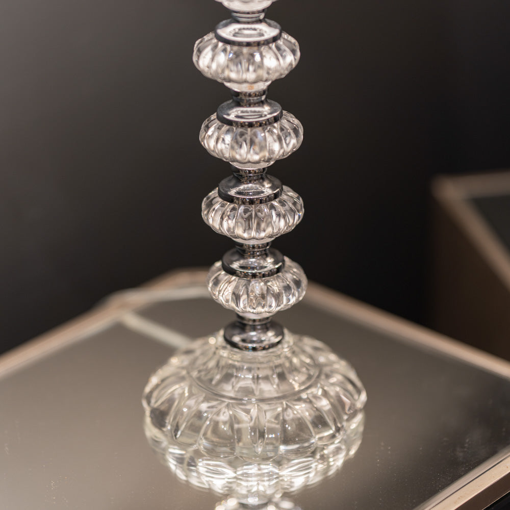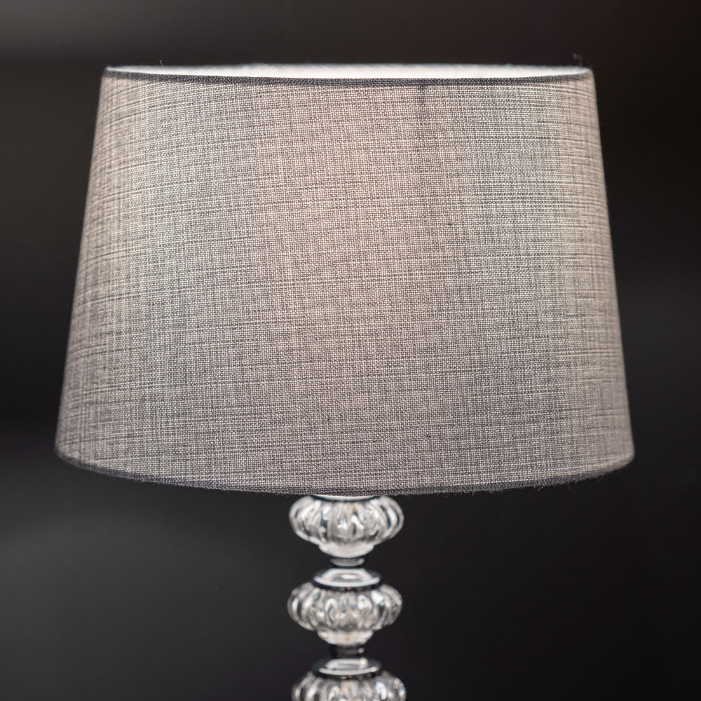 With its curvaceous chrome and cut-glass stem, this lamp is a glamorous, feminine addition to any home. the shade, in palest grey, casts a soft, diffuse light.
