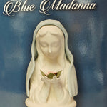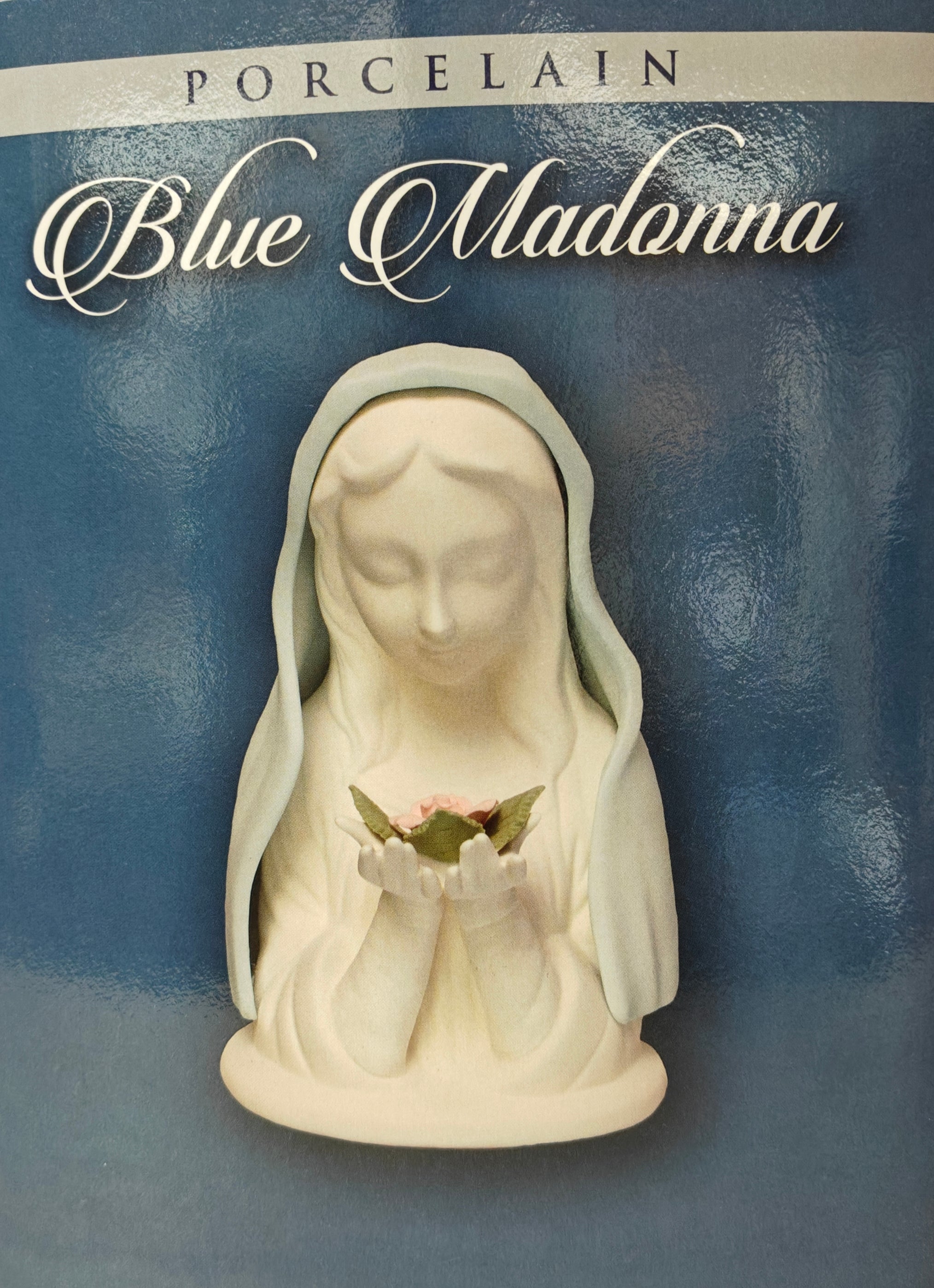 Porcelain Blue Madonna 19cm Statue Figure with a Light attached to the base. There is so much expression in this statue as it portrays Mary holding a lily flower. A beautiful statue defined by fine accents, simple coloring and elegant features. Simply beautiful!