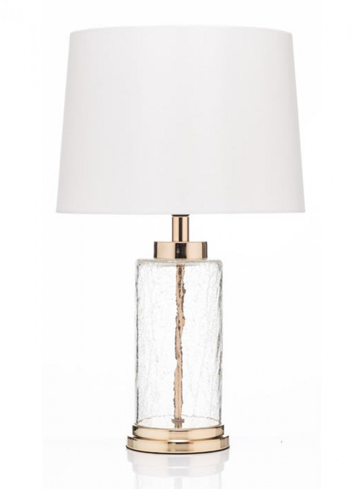 Introducing the Glass Table Lamp & Shade from The Grange Collection. standing at a height of 49cm. This lamp features a crackle effect glass cylinder body and gold base and top. Paired with a coordinating shade, it provides soft, ambient lighting ideal for creating a cozy atmosphere in any room. Perfect for those seeking a blend of elegance and charm in their home lighting solutions.