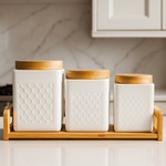Comes as a set of three canisters in varying sizes, all neatly displayed on a natural wooden tray—ideal for organized and elegant storage. -