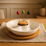 The smooth-turning wooden base elevates presentation and accessibility, making sharing dips and condiments effortless and enjoyable. -