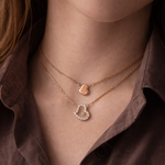 This charming double heart necklace is crafted in romantic rose gold. The double stranded design features an open heart completely outlined in dazzling clear crystal accents. A slightly smaller, solid rose gold heart hangs above it with a single clear crystal stone set into it. The hearts suspend jauntily on their sides from a brightly polished cable chain.