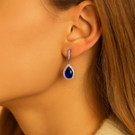 These earrings combine bold colour and refined detail in a design that's both glamorous and wearable. The deep blue pear-shape centre stone captivates, while the surrounding halo of crystals adds elegance and depth. Whether you’re dressing up for an evening event or adding sophistication to your everyday attire, these earrings make a powerful statement without overwhelming your look.