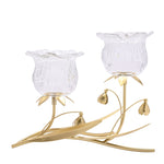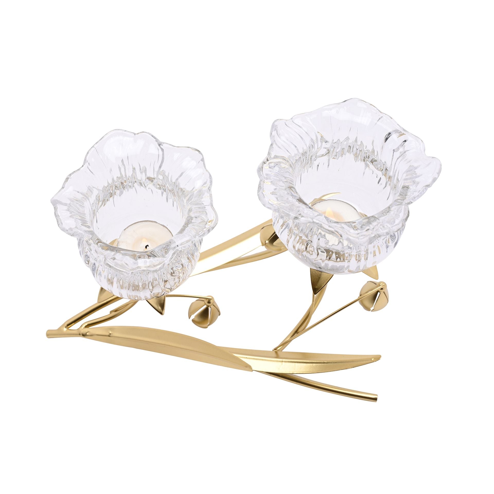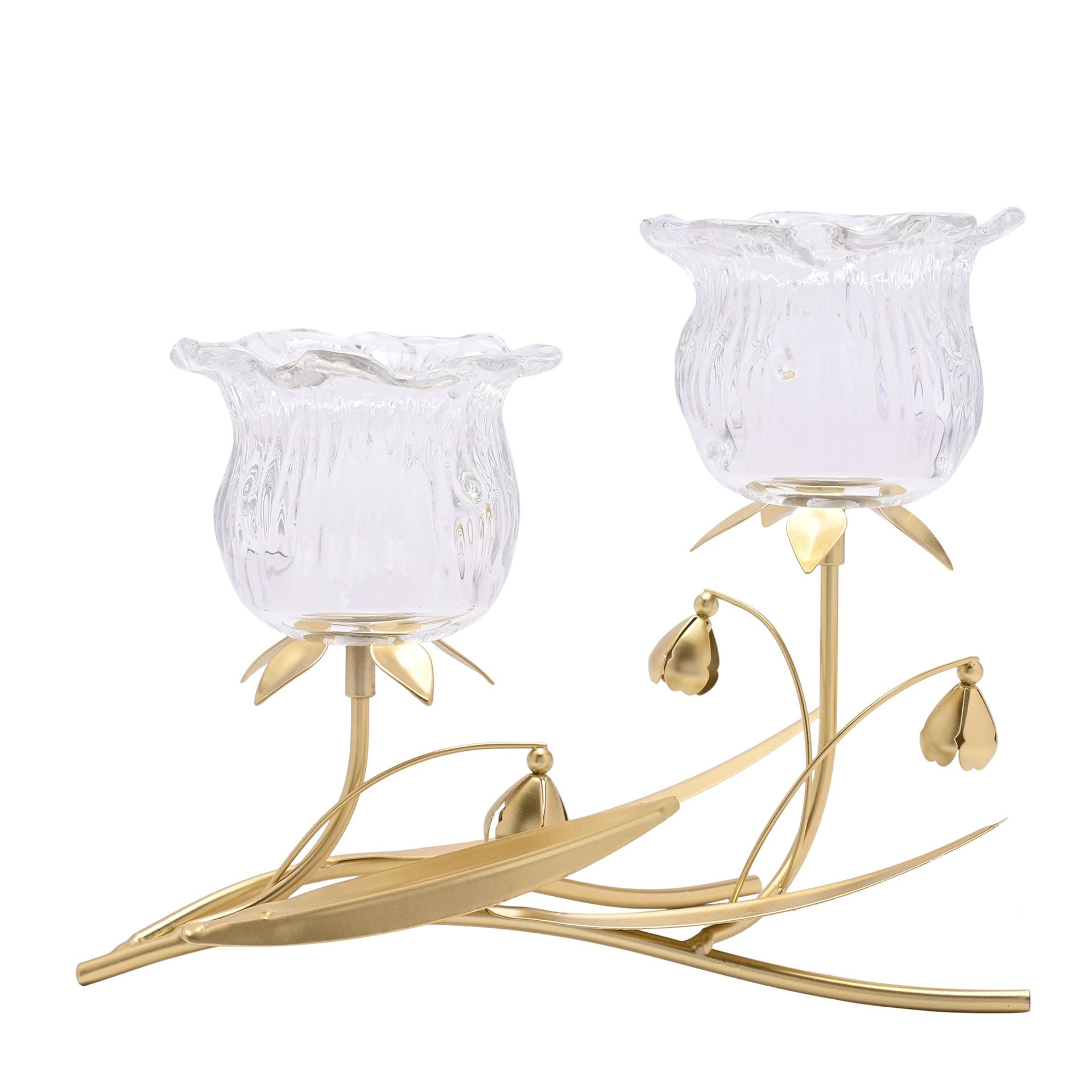 Bring modern glamour to your interior with the Hestia 2 Stem Clear Glass Flower Candle Holder. This stunning piece features two elegant glass vases on an ornate golden metal stand. The floral-inspired shapes add romantic charm to any room.