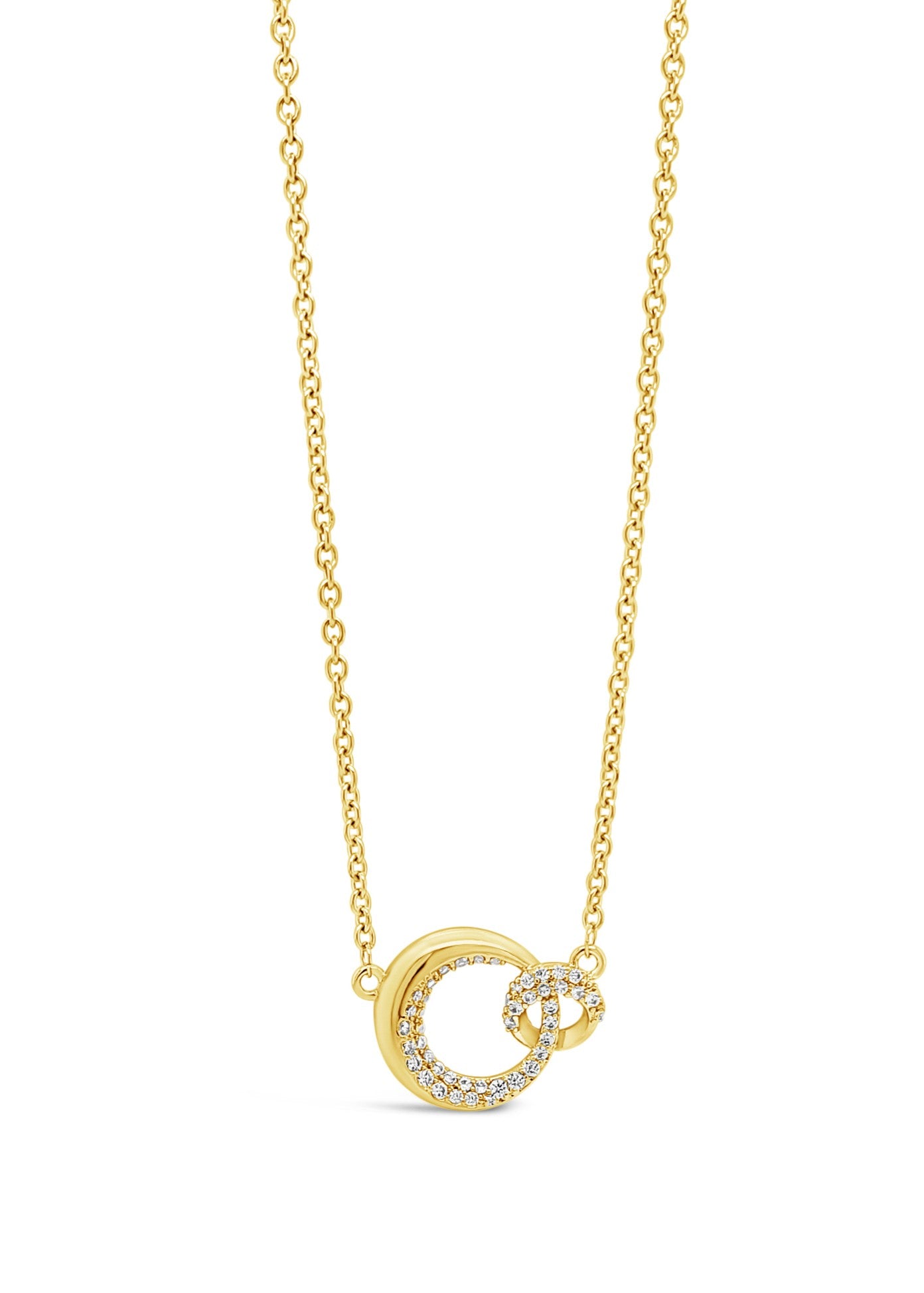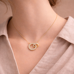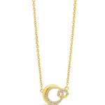 A symbol of connection and elegance, this pendant features interlocking gold circles enhanced with shimmering crystals.