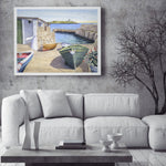 I painted this picture during a beautiful spell of sunny summer weather, that we too seldom get. The bright sun on the whitewash walls, the vibrant colours of the boats and the azure blue of the sea reminded me of fishing port you might see in Greece or Portugal.