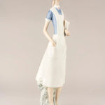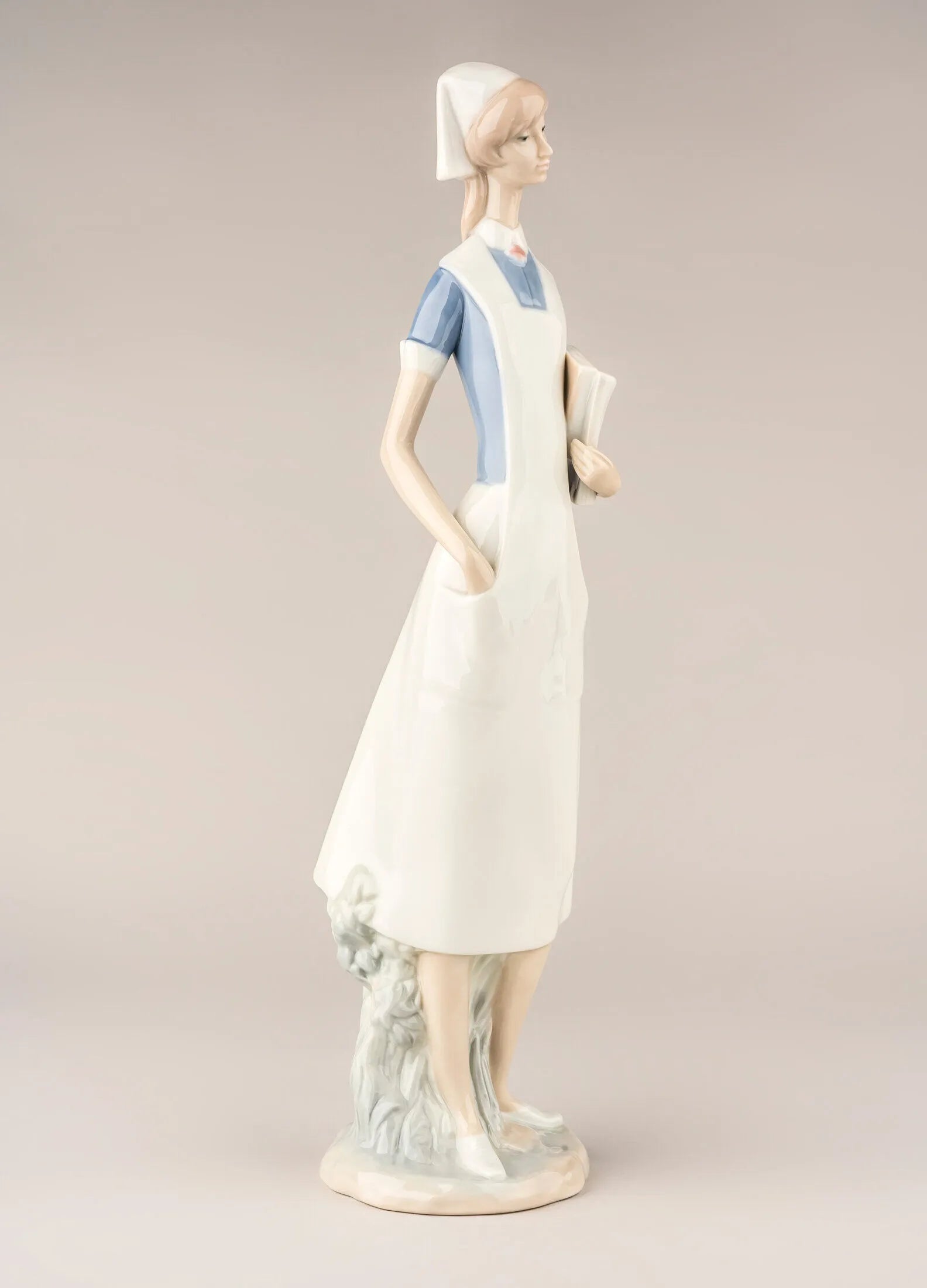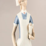 Nurse figurine in glossy porcelain with white and blue uniform.