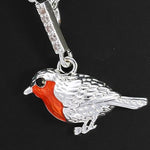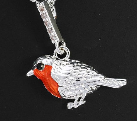 Silver plated robin with enamelled red breast detail and crystal studded post and chain.