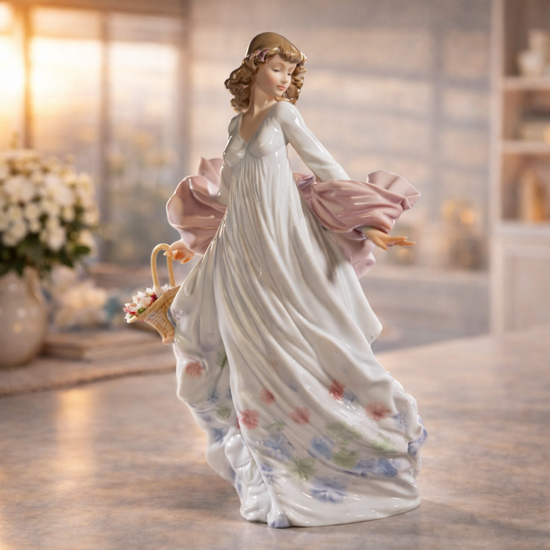 Her gentle pose, windswept shawl, and basket of flowers create a sense of lightness and movement, while the pastel tones and glossy finish highlight Lladró’s renowned craftsmanship. Every detail — from the sculpted folds of the dress to the subtle expression — reflects the artistry and refinement that define Lladró porcelain.