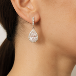 Each earring features a pear-shaped centre crystal embraced by a dazzling halo of clear stones, suspended gracefully from linear bales accented with round crystals. -
